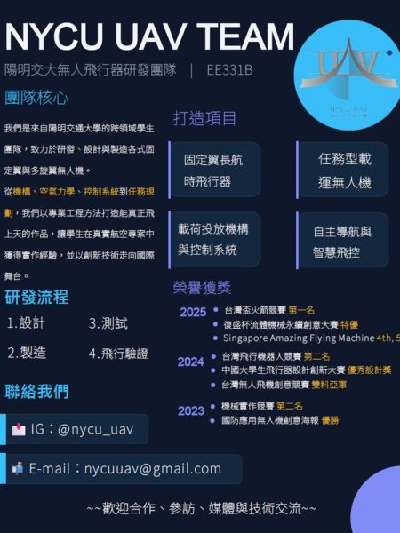 NYCU UAV 無人機團隊由陽明交通大學學生自發組成,致力於無人飛行器之設計、製造與系統整合。團隊以工程實作為核心,透過跨領域合作,培養學生在航空工程、系統工程與專案管理上的實務能力,並將研究成果應用於實際飛行驗證與競賽舞台。
